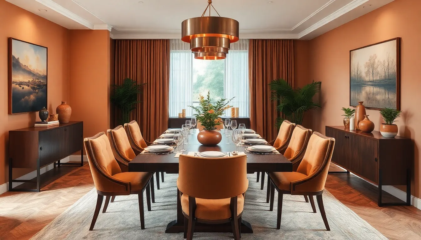 Modern and traditional styles coexist beautifully within amber interiors. Contemporary furniture often features sleek lines and minimalist designs. Classic pieces, such as solid wood tables and upholstered chairs, introduce timeless elegance. Mixing these styles creates visual interest and highlights the unique character of the space. Decorative elements, like warm-toned artwork and curated ceramics, provide additional charm. This fusion ensures that the dining room feels both stylish and comfortable, appealing to various tastes while maintaining a cohesive aesthetic.